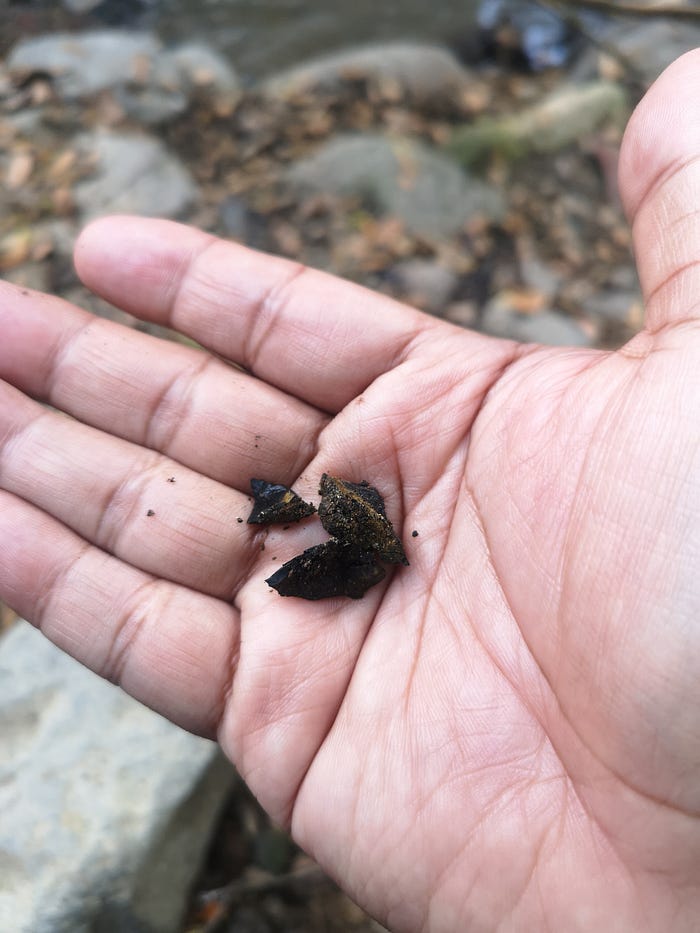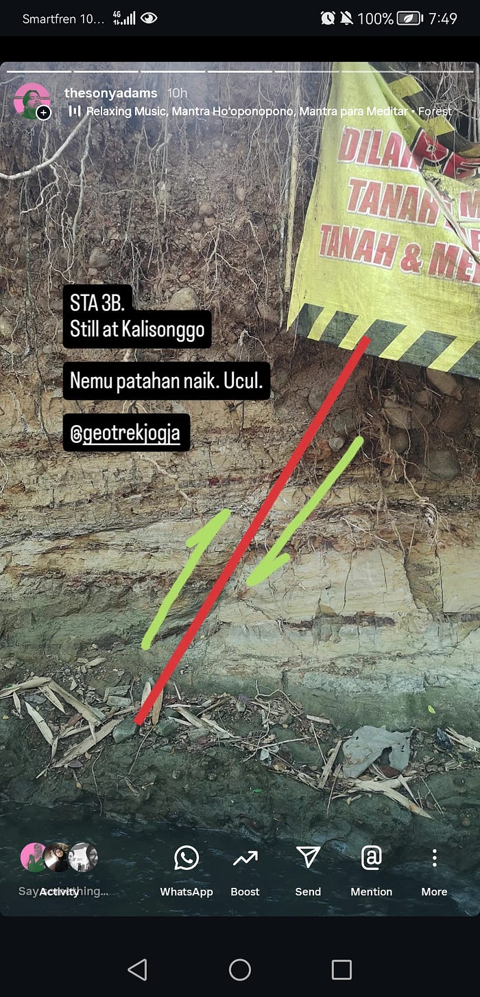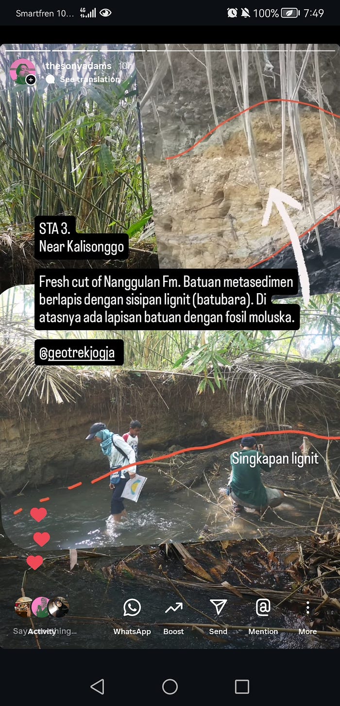 Di sungai itu tersingkap fresh cut of Nanggulan Fm, yakni formasi batuan tertua di Yogyakarta, lebih tua dari Gunung Gamping di UMY itu. Umurnya kala Eosen awal kalau ga salah. Susunannya sebenernya adalah batu metasedimen (ke arah metasedimen) dengan sisipan fosil renik yang lumayan bisa dilihat dari kejauhan. Di bawahnya terdapat lapisan lignit — batubara berkalori rendah — yang berwarna hitam. Nah, baru tahu kan di Yogyakarta ternyata ada batubara? Ya, sama.